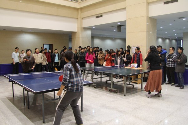 联谊球赛将师生混合分为A、B两队,正式比赛由队内选拔和团体比赛两个阶段组成。下午3点30分,比赛正式拉开帷幕。由郭成安、卢湖川两位领队老师分别带领其他几位老师、学生们进行队内选拔,以了解每位同学的特点和实力,为最终团体比赛热身。在队内选拔时,同学们既与老师切磋了球技,还在休息的间歇与老师们热情地聊天、积极地研究对阵策略,很快拉近了师生间的距离。