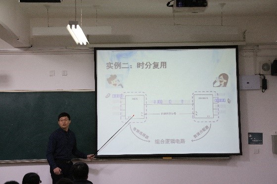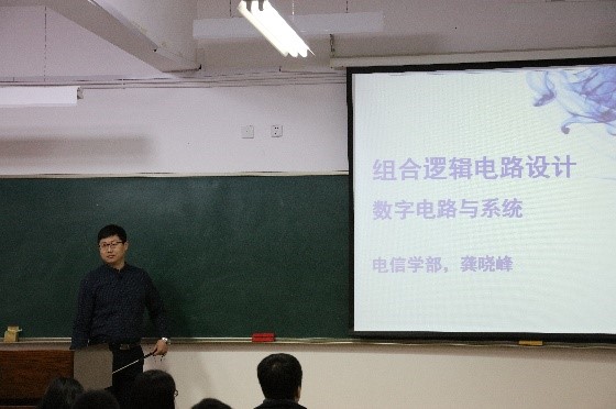 龚晓峰老师的参赛内容是《组合逻辑电路设计》。在对课程内容进行简单回顾之后,他首先通过生活实例引出主题,又通过简洁明了的板书介绍了组合逻辑电路设计的三个基本步骤。随后龚老师通过两个具体的设计案例,详细讲述了组合逻辑电路设计的方法和步骤。李慧老师的参赛内容是《电磁波的极化》。李老师借助精心准备的视频、教具、天线实物等,向同学们生动、清晰地解释了电磁波极化这样一个有些抽象的概念。并通过PPT讲解、板书推导等授课形式,详细讲解了线极化、圆极化等不同的极化类型及其实际应用。课堂上,两位老师多次与学生进行互动,同学们积极踊跃回答问题,课堂气氛轻松、活跃。展现了电信学部良好的师生风貌。